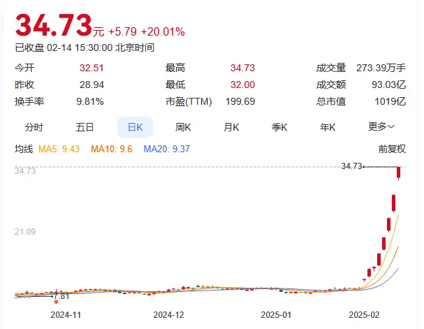 光线传媒今日再度飙升,截至收盘,该股涨停报34.73元/股,续创历史新高,全日成交93亿元,最新市值1019亿元。至此,该股近8个交易日已累计大涨超260%。