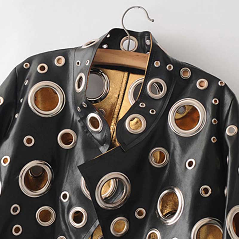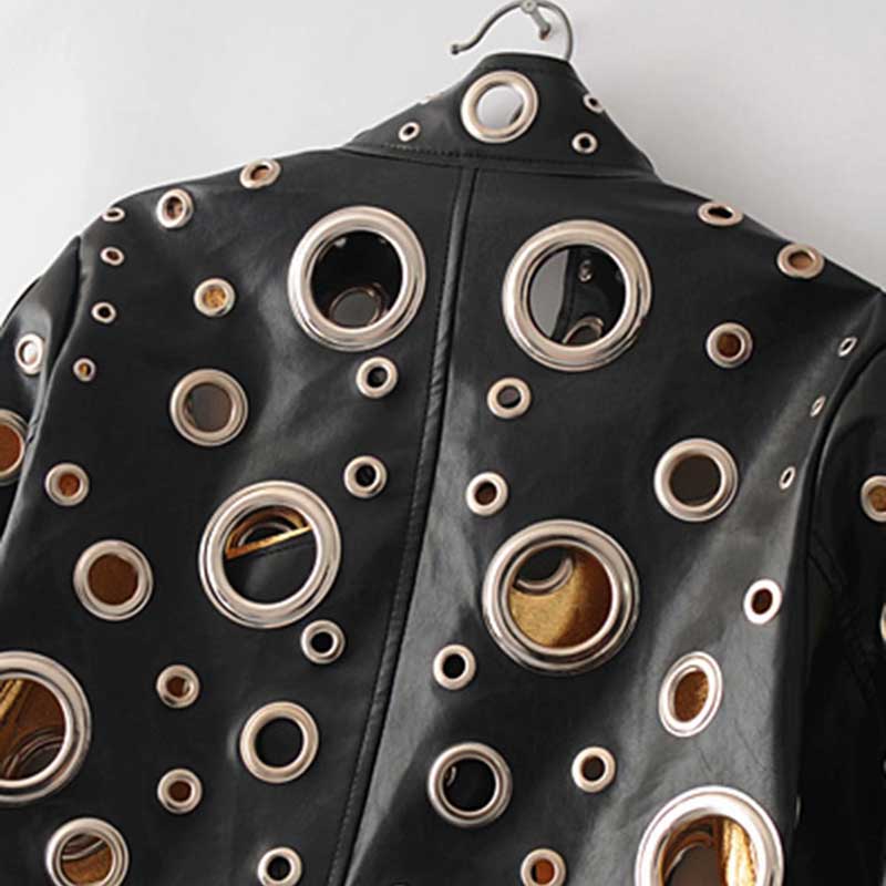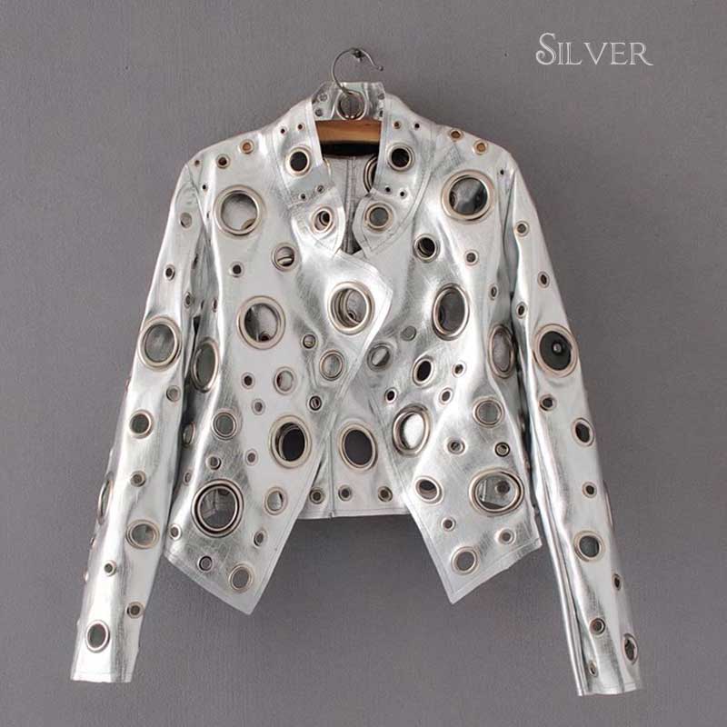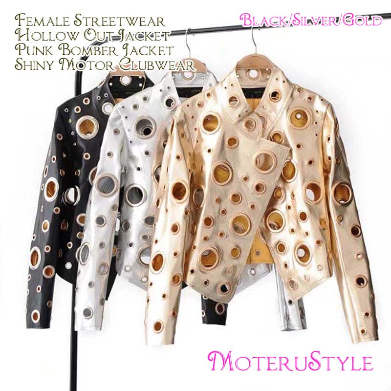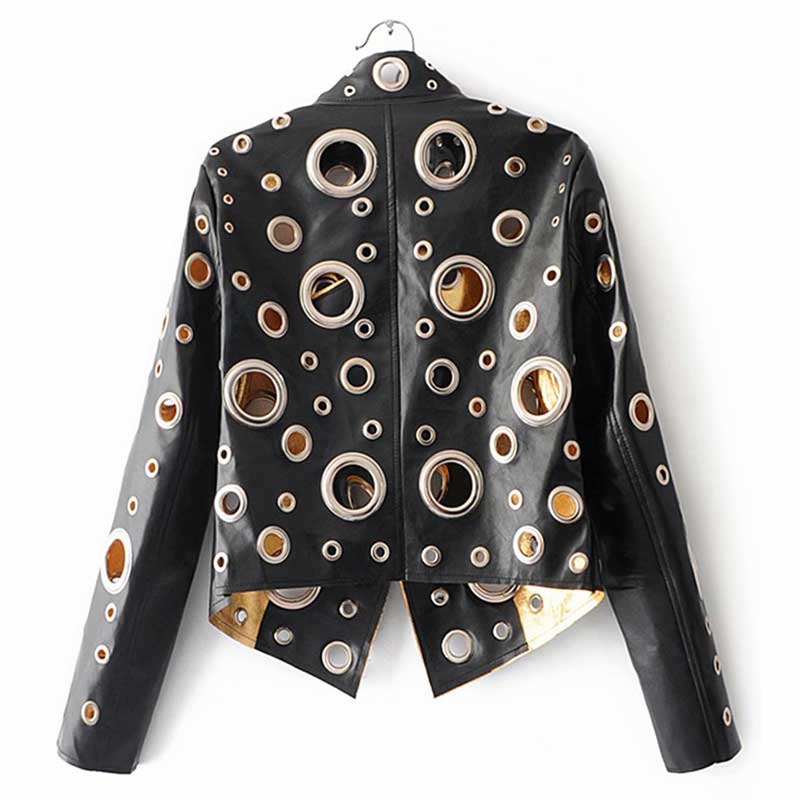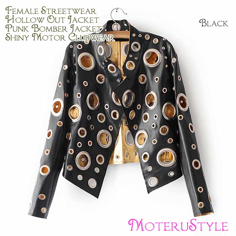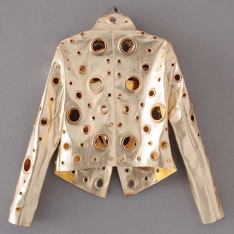 ホーローアウト・バイカーボンバー・メタルホール・中空の穴・リベットプロセス、 バイカージャケット、モーターウェア、ゴールデンローカットジャケット、ストリートウェア、 スタイリッシュデザイナーウェア、レディースファッションフェイクレザージャケット・ショートコート |