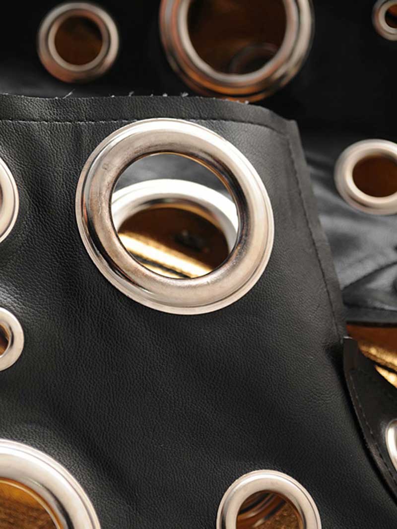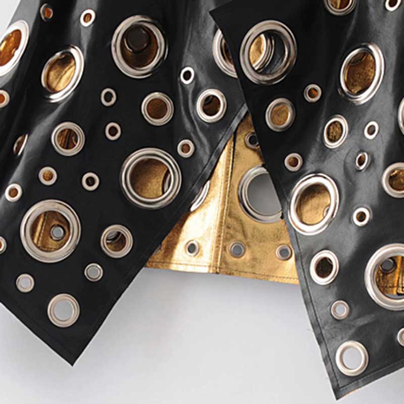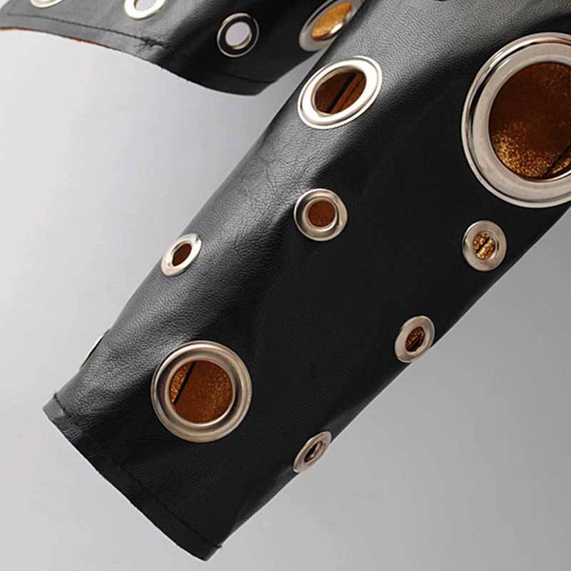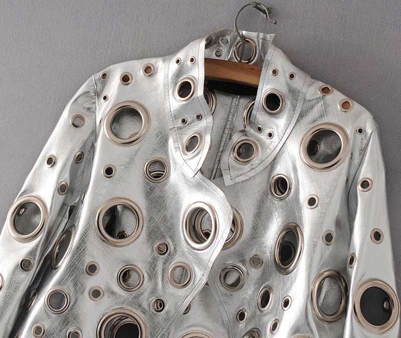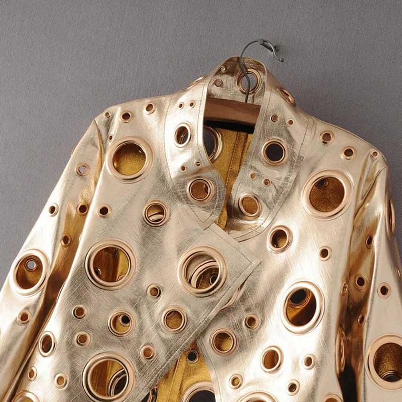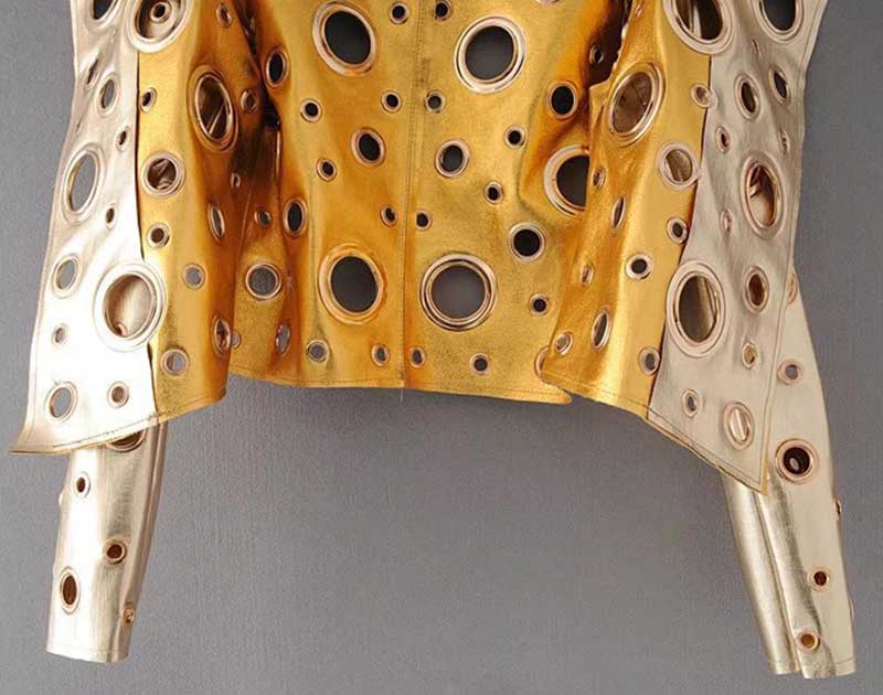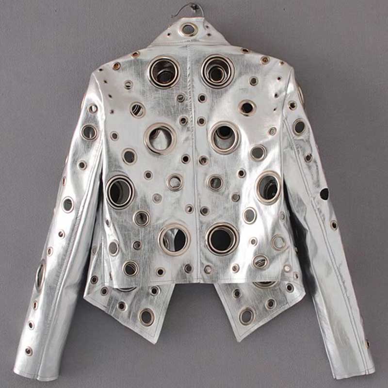 ホーローアウト・バイカーボンバー・メタルホール・中空の穴・リベットプロセス、 バイカージャケット、モーターウェア、ゴールデンローカットジャケット、ストリートウェア、 スタイリッシュデザイナーウェア、レディースファッションフェイクレザージャケット・ショートコート |