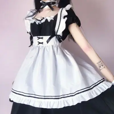 Coldker Women Maid Outfit Anime Long Dress Black and White Apron Dress Lolita Dresses Cosplay Costume