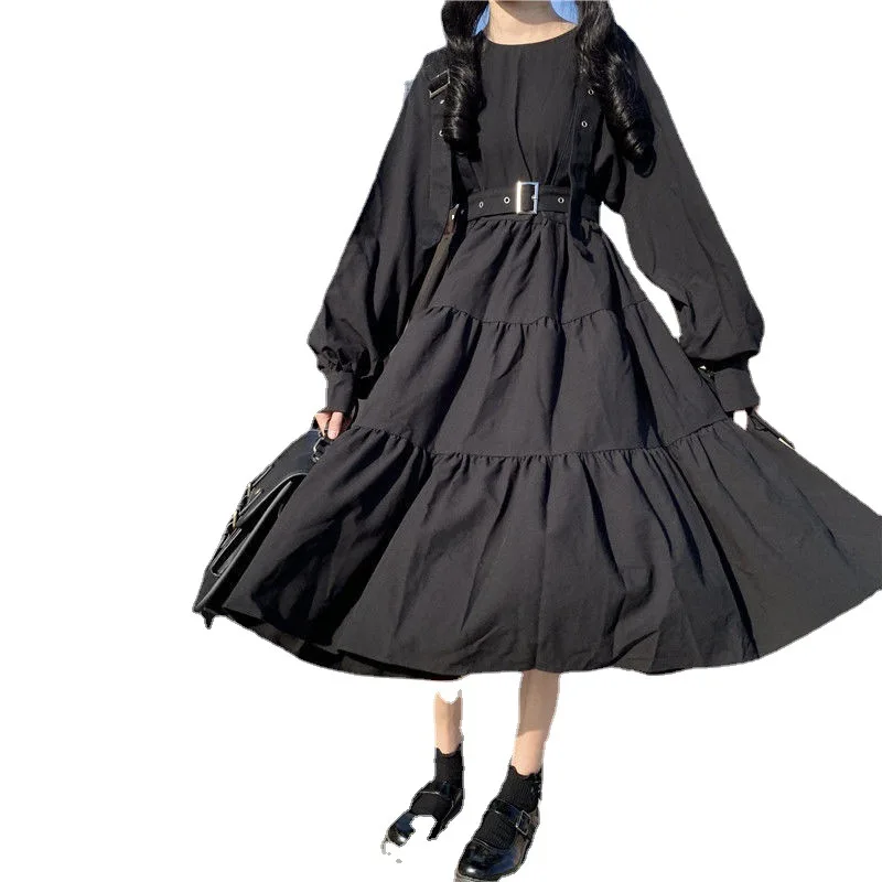 ★MoteruStyle! Lolita Style! Gothic Style Black Dress Women vintage lolita Dress Punk Cute Long Sleeve Black Midi Dress!