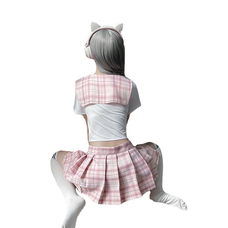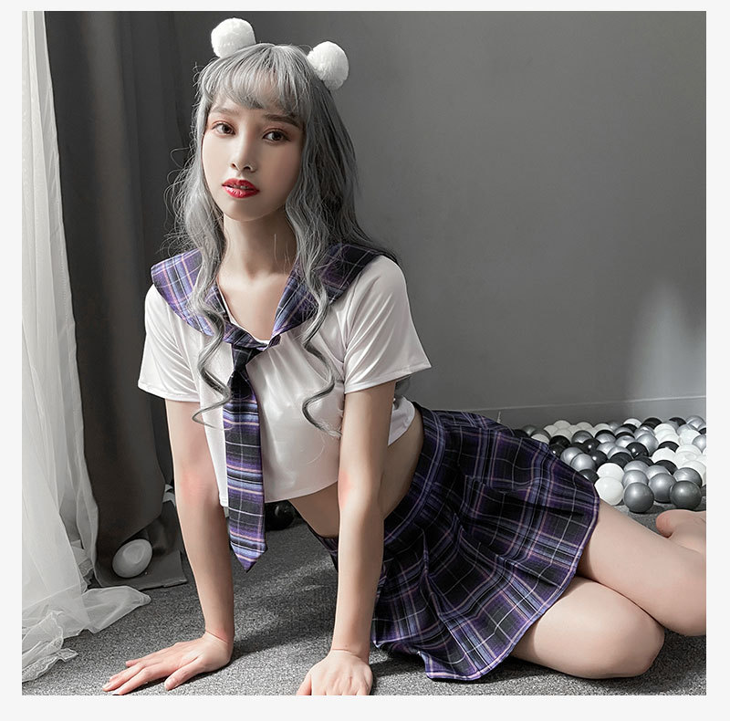 Color: white + blue grid [short top + pleated skirt + bow tie + T pants], white + pink grid [short top + pleated skirt + bow tie + T pants], white + purple grid [short top + pleated skirt + Bow tie + T pants]
