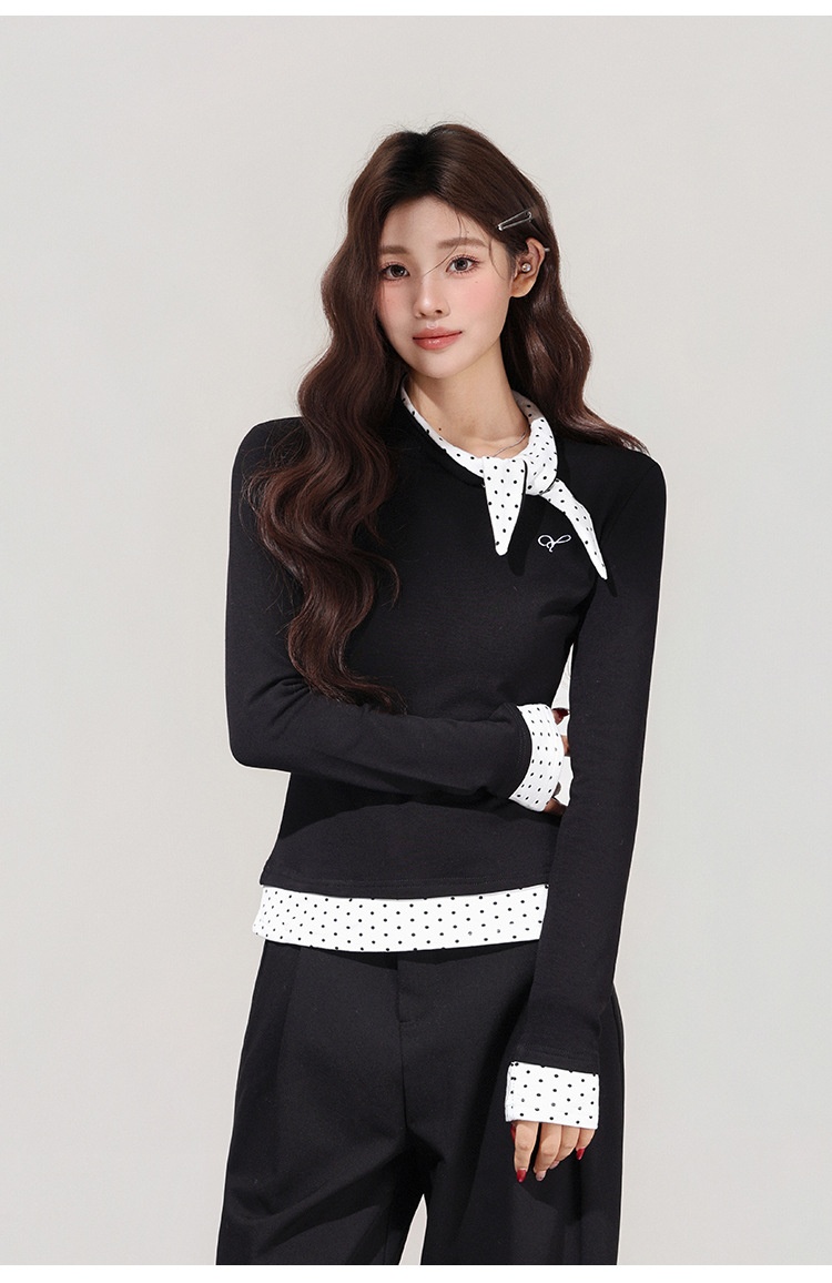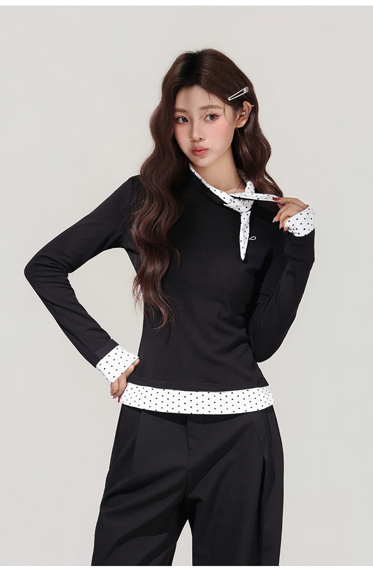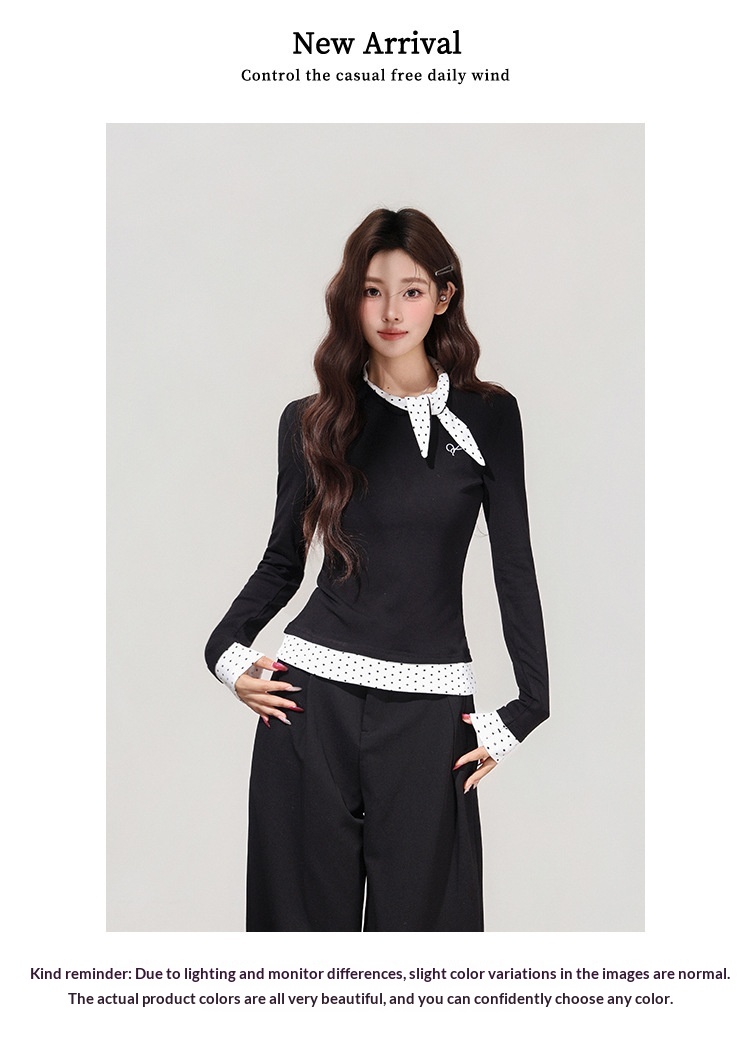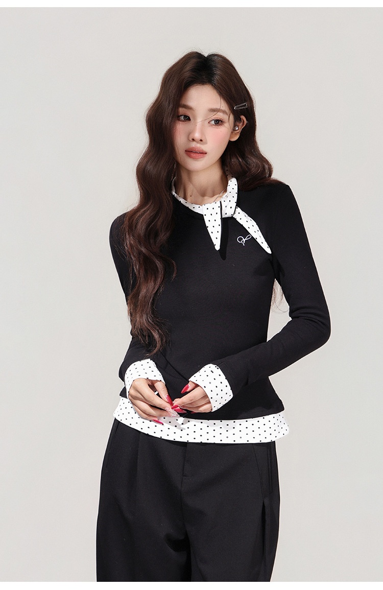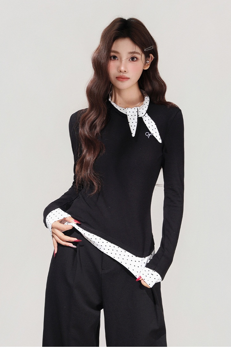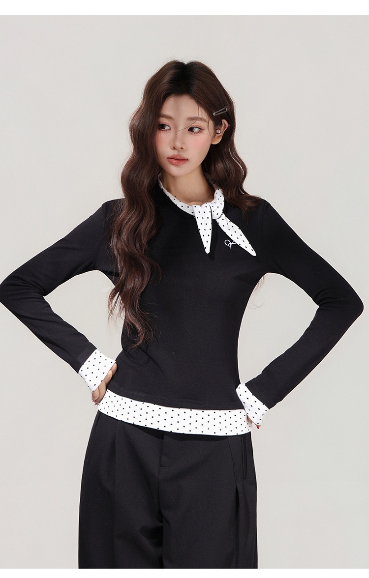 【MoteruStyle】Women’s Black Polka Dot Bow Fake Two-Piece Long Sleeve T-Shirt 【Show Yourself】